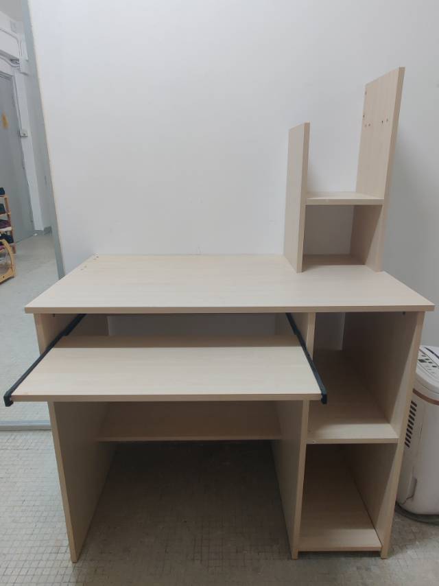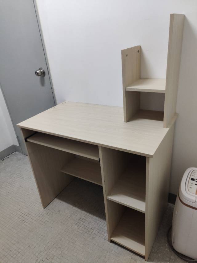 木製電腦桌,配有鍵盤抽屜及多層儲物櫃。桌面長90cm,寬50cm,高75cm。