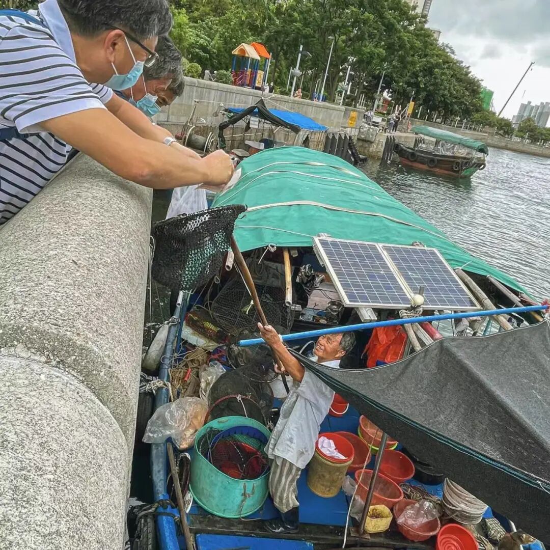 渔民会将处理好的鱼装在袋子里用渔网递给他们,他们亦会将钱放入网中给渔民。