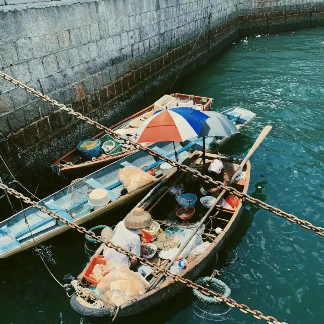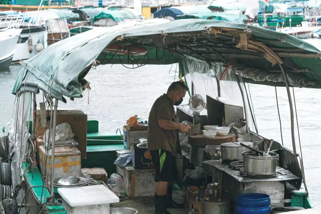 鸭脷洲海旁一带,岸边会停着贩卖海鲜的船家。