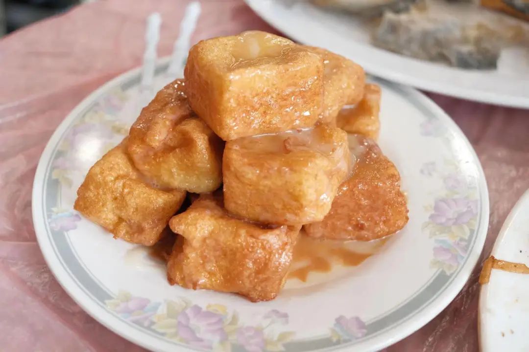 店铺将白面包切成方块,沾上蛋浆炸成金黄色,淋上炼奶及花生酱。