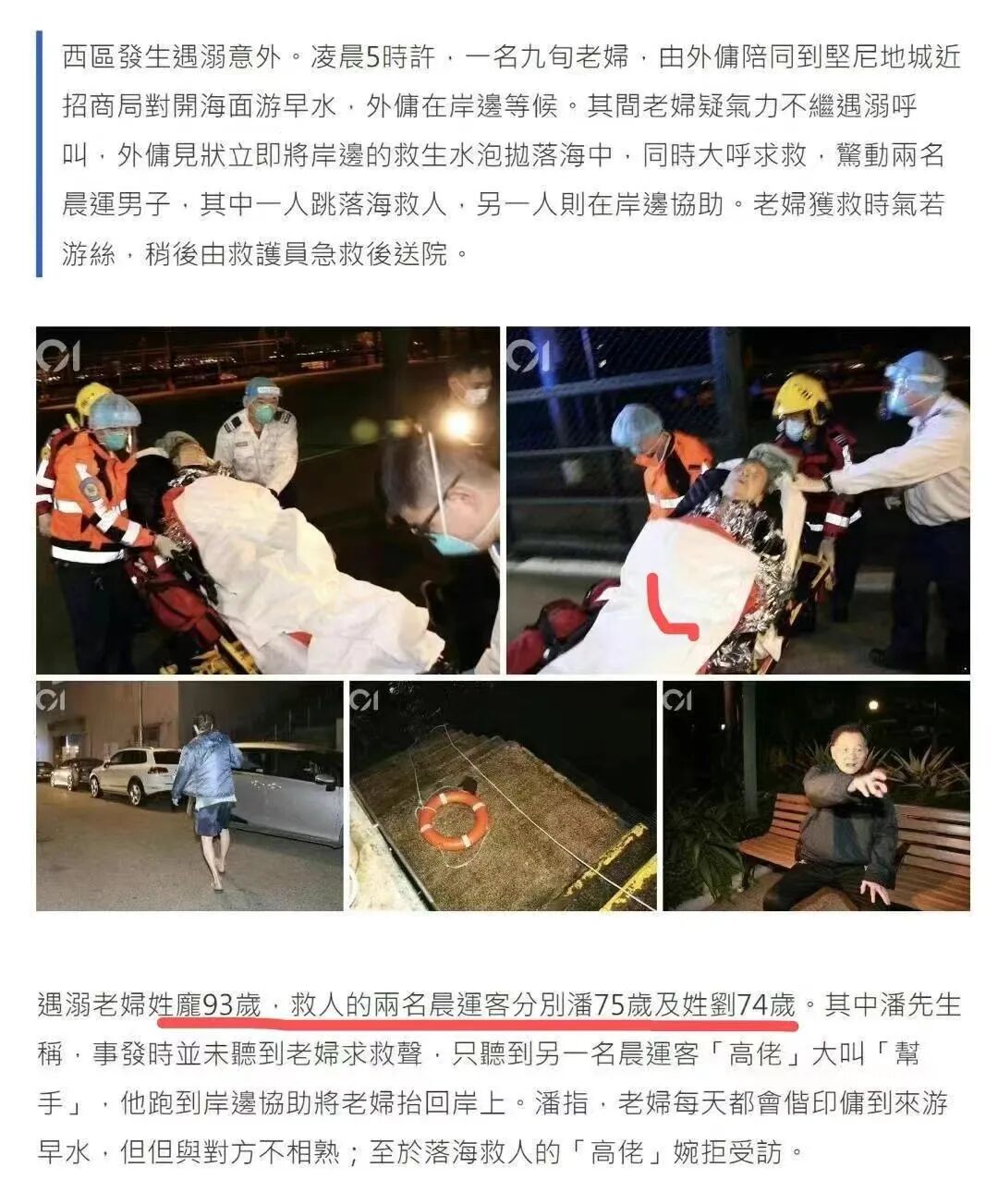 香港一名93岁的老太太凌晨5点在海里冬泳溺水,两名73岁和74岁的晨运人士将其救起。