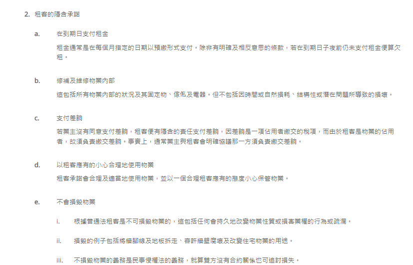 租客有责任修补、维修物业内部的状况及其固定物、家具和电器。