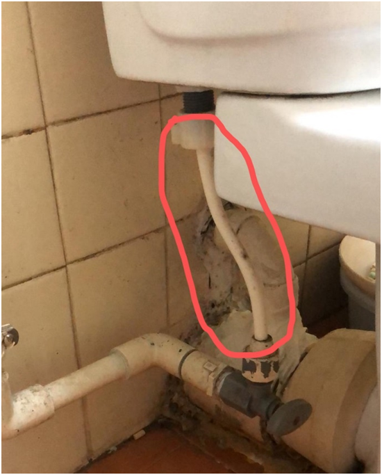 果不其然,水龙头是拧紧的,但是马桶水喉的软塑胶却裂了一条大缝——这应该就是罪魁祸首了。