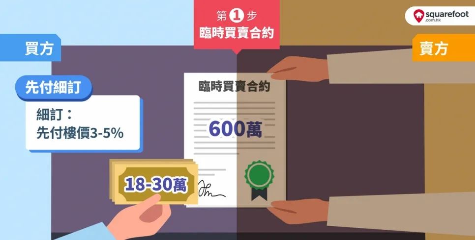 确定买楼后,就要先签一份临时买卖合约,一般是买家先签,然后代理再去找卖家签字。签临约的时候需要支付订金,一般是房价的3-5%,俗称“小订”。