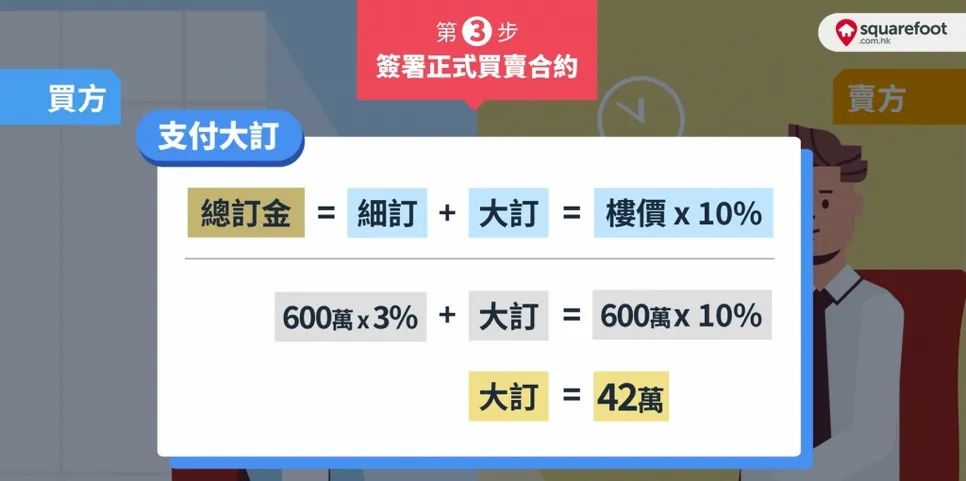 签署正式合约时,需要同时缴付“大订”。“小订”和“大订”通常等于楼价10%。
