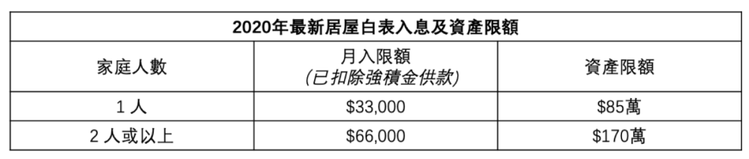两人或以上家庭:每月总收入在66001港币至85800港币之间,总资产不能超过221万(2020年数据)。