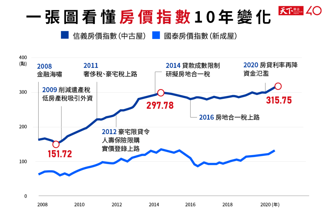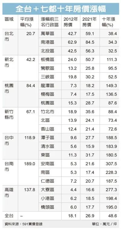 最近10年间,台湾房价涨幅将近50%,特别是近几年涨幅明显,2021年台湾6大城市年平均涨幅为11%。
