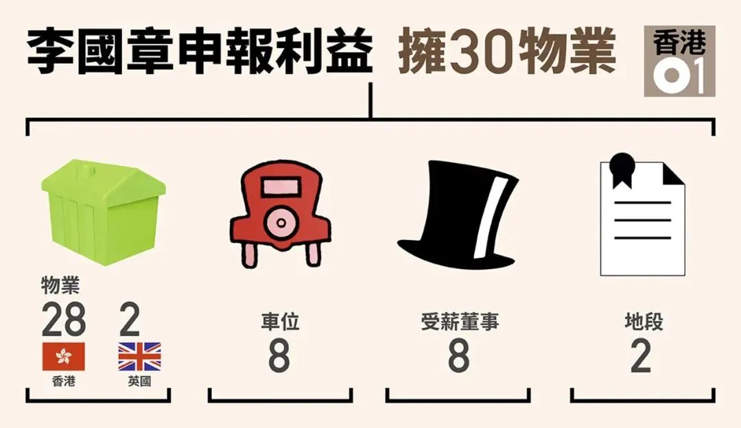 李国章在任时,向香港政府申报了73个物业,有房、有地、还有车位,遍及香港各区,还有几个物业在英国。