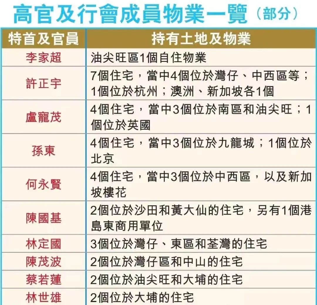 本以为半套房已经够少的了,万万没想到,前特首林郑月娥一套都没有!