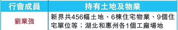 除了土地,刘业强手上的物业也不少,他拥有6栋住宅物业、9个住宅单位,同时在内地湖北、惠州还各有1个工厂用地!