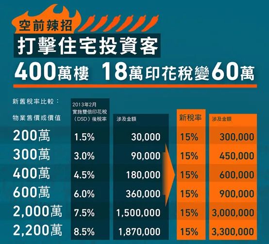 本身已有房的永居再买房,税率高,统一15%,这种情况下的从价印花税,也有一个更常见的名字“双倍印花税”(DSD)。