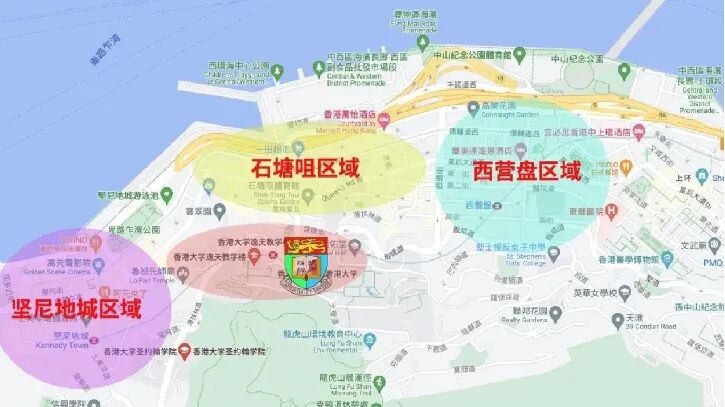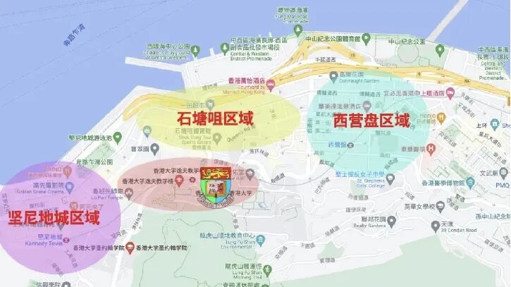 港大坐落在坚尼地城区域、石塘咀区域以及西营盘区域中间,坚尼地城和西营盘与港大仅港铁一站距离,石塘咀步行8分钟可到港大,因此这三个地方最受港大学生的青睐。