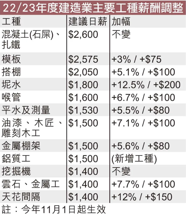 五十七万港漂都在这儿记不记得圈妹之前说过香港要输入外劳?香港人口老龄化严重,一些体力活没人做,所以准备引入外来劳动力,说白了就是内地的。这个政策之前一直在讨论,今天终于官宣了!香港特首李家超先生(图:HK01)要引入什么行业?建筑业、运输业(航空业+小巴客车业),一共2万个名额。再说具体点,就是扎铁工、搭棚工等工人,还有专线小巴司机、旅游巴司机、机场地勤、机舱工作员等等。对内地人来说,来香港打工还是挺香的,毕竟这几个行业两地收入差距太大了,尤其是建筑业!香港vs内地建筑工人收入据说内地建筑行业普通工人工资大概是5000多,一些技术工种会高一些,日薪能有3、400左右。而香港的工资是他们的好几倍!来,我们直接看香港建造业总工会公布的官方工资表:2022/2023年度工资表(图:明报)请注意,这些都是日薪。工资最高的是混凝土工人,日薪2600港币;最低的是天花间隔工人,也有1250港币。当然,这种体力活不可能天天开工,通常一个月干20天左右。这么算最高的一个月能赚5.2万港币,最低的也能有个2.5万!这还没算加班费!地盘工的加班费大概是正常时薪的1.5倍,如果周日上班,有些地盘能给到2倍工资。圈妹还见过狠的!一天干十几个小时,一个月赚16万,拿到钱直接出去浪!新闻报道(图:香港01)而且建造业几乎每年涨薪,来看看香港建筑工人近10年工资变化,涨幅高的每年都超过10%了:工资涨幅(图:网络)之前有人担心,外劳是否也能拿到一样的工资,会不会像菲佣、印佣一样,最低工资只有4000多块。大可放心!外劳待遇有多好?今天香港特首李家超先生特意说了,外劳工资不能低于行业中位数。这主要是怕大家太卷,影响香港本地人的就业。香港特首李家超先生(图:HK01)工资高不说,外劳在香港还可以包住宿!香港住宿有多贵,大家也都心知肚明。今天港府特意强调,建造业劳工的雇主必须提供宿舍,政府还准备把元朗潭尾社区隔离中心改成宿舍,供外劳住。元朗潭尾方舱医院(图:HK01)而机场的外劳可以回内地住,机管局每日安排车经港珠澳大桥来回两地。机场(图:HK01)包住宿,一年净赚几十万,这也太香了吧!不过,港府也强调了,这只是个临时性政策,不是永久,还是要保障香港本地人的就业,等劳动力短缺问题被解决后,这个政策应该会取消。政策(图:FB)其实除了建造运输业,香港很多行业都准备引入外劳。这些全都要引入外劳今天,香港政府大笔一挥,宣布允许26个职业输入外劳,而且为期2年。这26个职位包括营业代表、售货员、侍应生、接待员、收银员、初级厨师、文员、电话接线生、洗衣工人、发型师、石工、渠工等。26个职业(图:HK01)好家伙,这不是各行各业都可以了吗?香港之所以要搞外劳政策,主要是香港实在是太缺人了,尤其是建造业!大家都说香港房价贵,房屋供应量不足,但盖房子也需要人啊!这几年香港也出了不少房屋政策,小到兴建公屋、过渡性房屋和简约公屋,大到北部都会区和明日大屿,这么多工程,没有人怎么搞。地盘(图:HK01)所以港府才仿照澳门、新加坡,推出了输入外劳政策,但这不是长久之计,长远方案还是要从香港内部来解决问题,培育更多的年轻人入行,提高行业待遇。不过也有人担忧,新政策会不会导致香港越来越卷?对此,你怎么看呢? 本文作者 天天被爸妈远程催婚的 @圈妹*图像影音来自网络,本文由港漂圈原创,转载请联系港漂圈公众号(ID:gangpiaoquan)参考资料:1.《输入外劳|机场配额6300人涉10工种雇主缴费资助本地工人交通费》,HK01,2023-6-132.《輸入外勞|「補充勞工計劃」26工種可聘外勞 包括售貨員、侍應、文員、髮型師等》,星岛日报,2023-06-133.《传政府最快本周内公布建造及运输业输入外劳》,东网,2023-06-13↓↓↓港漂圈今日推荐↓↓↓