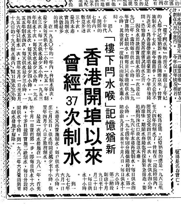 五十九万港漂都在这儿今天是国庆节,香港大街小巷都是中国红!(图源:中通社)而今天,趁着国庆假期,圈妹还要给大家讲一个香港和内地之间更感人的故事。首先问个问题,每每提到香港,你脑海中的画面是不是这样的: (图源:网络)高楼林立,繁华美好。 没错,香港是一个国际化大都市,也是全球最大的贸易港之一,你想买什么基本都能在这找到。 但你可能不知道,过去的香港竟只是一个没水、没电、没吃的三无小渔村。 老香港(图源:网络) 这些年香港一步步逆袭,过程中有个“人”一直在助攻。而以下是它的一次神助攻。当香港什么都没有香港虽然沿海,但是没什么河湖,降水也极不稳定,所以淡水从一开始就不足,当年还有“贫瘠岩石”的称号。 对于老一辈的香港人,他们的童年生活里有一件事必然印象深刻——制水,限制的制。(图源:网络) 1902年香港大旱,每天只有1小时供水。 1929年又是大旱,全港6个水塘5个都干涸见底,政府从四级限水,一路提升到七级(街喉不再供水,必须去供水站取水),7万多人因此回了内地避难。 别说发展,当年香港连基本生存都成问题。(图源:星岛日报) 怎么办? 一些华人企业家坐不住了,心想着:背靠祖国,为何不求助? 自家儿子都开口了,哪有不帮的道理。虽然50年代内地也不过是紧巴巴过日子,但给香港供水一事很快就被中央提上了日程。(图源:网络) 动员广东政府、勘探路线、建深圳水库,内地政府抱着一万分热忱为香港同胞忙前忙后,可到头来这事却变成了一厢情愿….. 原来供水,内地忙活着,百姓期待着,港英政府却怕了,怕因此受制于内地。 工程停了,香港老百姓依旧在没水的日子中挣扎。(图源:网络)就这样又过了几年,港英政府终于意识到缺水问题已经到了千钧一发的时刻,于是又重新和内地谈判。 这一次成了。1961年2月1日,深圳水库正式向香港供水,双方约定,每年提供2270万立方米(50亿加仑)淡水。港英当局与广东省政府签署第一份供水协议(图源:网络) 其实,内地本想免费供水,毕竟当时的香港不同于今日,老百姓的日子并不富裕。但你懂的,港英政府怕你口碑太好、怕成依赖,所以坚持花钱买水,而且买的量也非常克制。深圳水库(图源:网络) 另一边,港英政府开始大建水库、大搞海水淡化工程。 如今香港最大的水库“万宜水库”就是那时的成果,可当年它是耗资13.5亿,以超出预算近一倍的价格完成的。万宜水库(图源:百科) 还有海水淡化,成本高产量又不大,在当时其实根本吃不消,但为了早日摆脱依赖,港英政府也是拼了命。 只可惜,一场天灾又把香港打回了原型。香港供水,列入国家计划1963年,香港遇到有史以来最严重旱灾。 限水也达到了有史以来最高级别,每4天供一次,每次4小时。(图源:网络) 那个年代,借水成了比借钱还难的事,街坊之间因为轮水时间,大打出手甚至进监狱都是常有的事,后来甚至衍生出一个词——武装取水。民众打水经常都需警员出动(图源:网络) 那一年,广东同遭大旱,但深圳水库供水不仅没有停,还勒紧裤带自减用量。在原来基础上多供港317万立方米,甚至让香港派巨轮到珠江口免费取水。到珠江口运水的船(图源:网络)当年“伊安德”号每天下午5点从香港开往广州的画面,对很多老一辈来说应该是记忆犹新,可年轻一代却未必知道这些患难相济的故事。(图源:网络) 可惜,广东这样的援助依旧只能解燃眉之急,香港需要更强有力的支持! 1963年10月,英国政府通过外交途径正式向中国政府提出东江水供港请求。 1963年12月,周总理出访非洲前专程转经广州,商讨东江水供港工程,会上他说:香港居民95%以上是我们自己的同胞,供水工程应由我们国家举办、列入国家计划!(图源:网络) 1964年1月,中国转告英国政府和香港当局:中国政府决定兴建东深供水工程向香港供水。中国政府将负责全部工程设计和建设,并负担全部费用。 同年,周总理亲自批示拨出专款3548万,并特别说明是用于为香港同胞尽快解决食用水困难。(图源:网络)当时中国刚刚走出三年经济困难时期,百业待兴,这个在今天看起来不算什么的拨款数在当时拨出却并非易事。 但再难,东深供水工程都跨出了第一步。但没想到,这第一步,只是最简单的一步。宏大的北水南调1964年2月20日工程正式动工。 工程初期全长83公里,最大的难度是要将中间50.5公里的支流“石马河”逆流回调。 换句话说,要将东江水从海拔2米,一级级提升至46米。 难吗?当然难。8级逆流回调东江水(图源:网络) 这个工程项目多,工地又分散,施工机械还不足,全要靠人力挖填、运料、打舂注浆。施工过程中还经历了5次台风暴雨,围堰3次被洪水冲垮。墙上口号“要高山低头、令河水倒流”(图源:网络) 但那时内地老百姓对“帮助香港同胞”这事超乎热情,对国家的号召更是一呼百应,一夜之间,荒郊野岭的工地盖满了工棚,施工高峰期工地上曾有2万多人。工程初期万人大会战(图源:中国网) 周总理还亲自批示,要求铁道部以东深工程物资运输优先,第一时间运至现场。 毫不夸张,举国上下都拧成一股绳,排除万难保障这条供港生命线尽早完工。(图源:中国网) 英国曾派水利专家组来沿线观察,看到施工场景后放言,工程完工至少要3年。 但最后,谁都没有想到只用了11个月。1965年3月1日,东江水开始供港,直至如今。 (图源:政府新闻网)香港市民扭开水龙头就有水用,这个平常到不能再平常的生活场景,背后