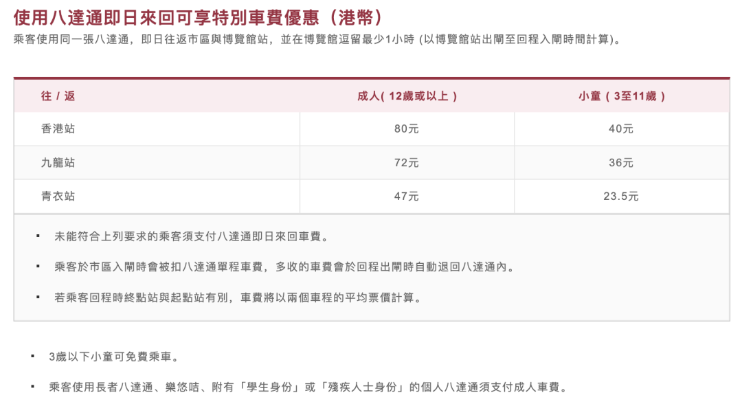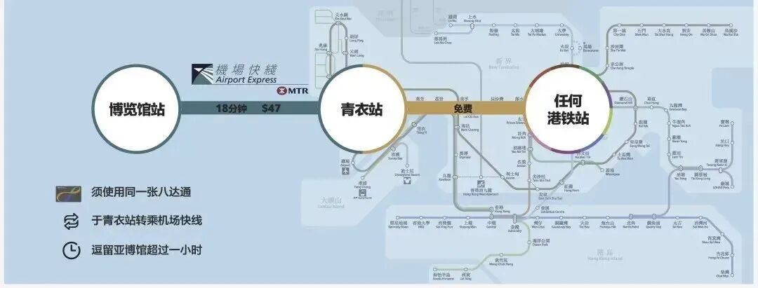 并且现在港铁还推出了票价优惠,只要你是当天往返,在青衣站转乘机场快线,在亚博馆逗留超过一小时,并且使用同一张八达通,往返只要47港币起!
