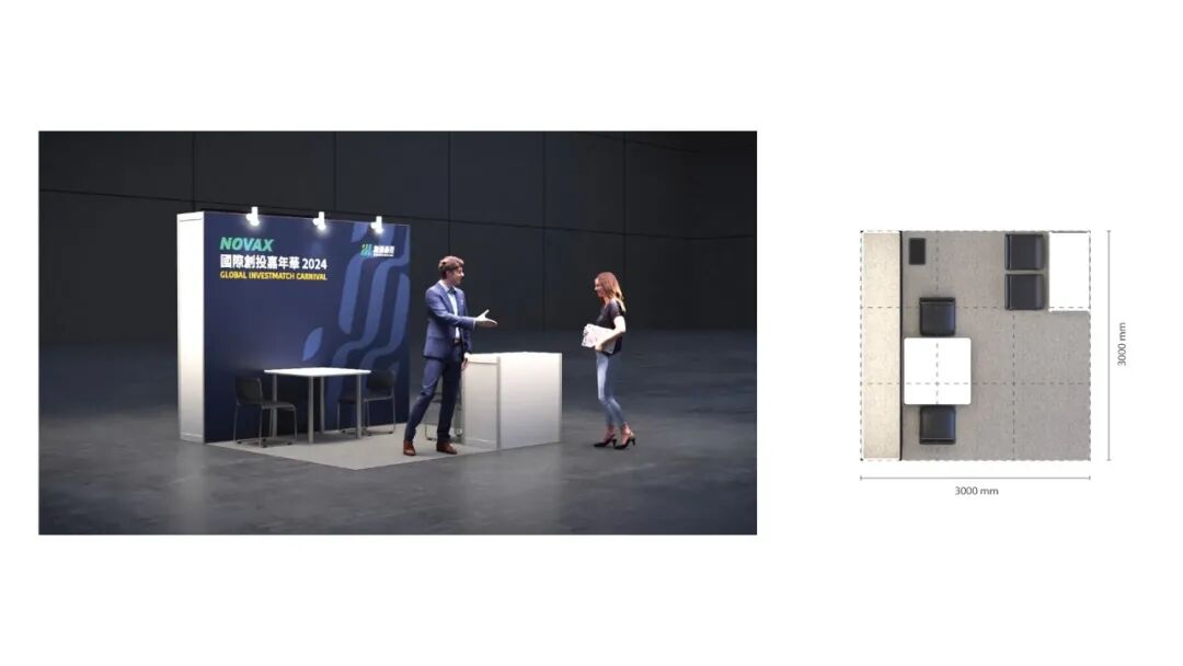 展位配置:展位白色 KT 背板 (1.5 米阔 x 2.5 米高),1个地柜 (1.5m×1m)、2张吧椅、1支长臂射灯(日光灯),不包供电插座。