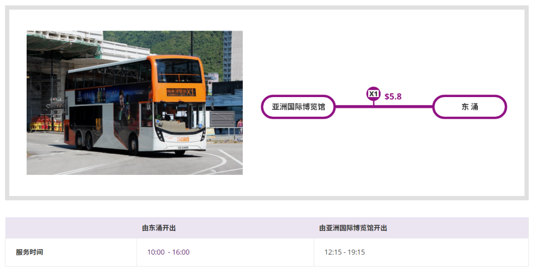 还有一个办法就是在港铁东涌站B出口,步行到东涌巴士总站,转乘特快巴士X1,到博览馆站下。