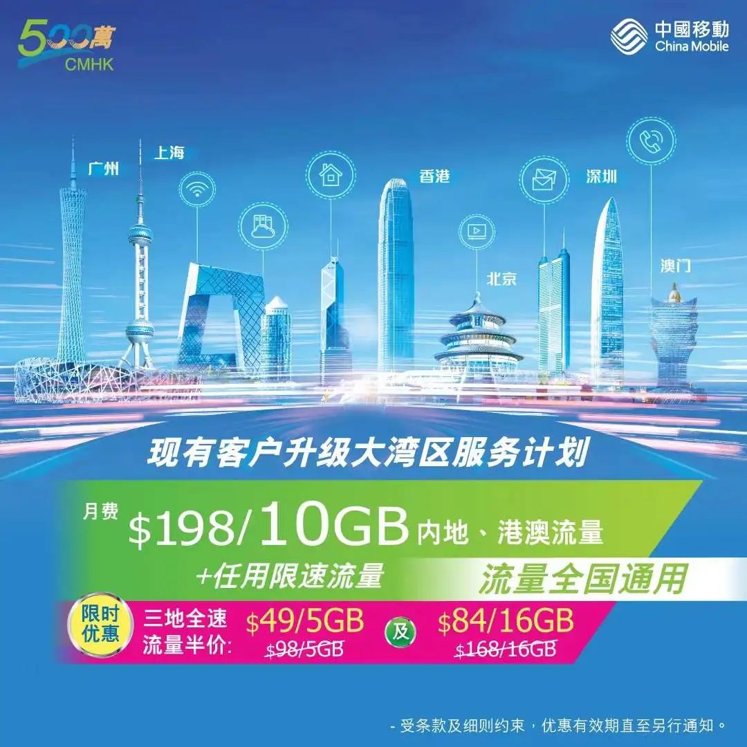 如果你是CMHK现有客户,想升级大湾区服务计划,签约24个月月费只需HK$198*,即可享受每月10GB+无限限速中国内地、港澳流量,中国内地流量可于全国通用。