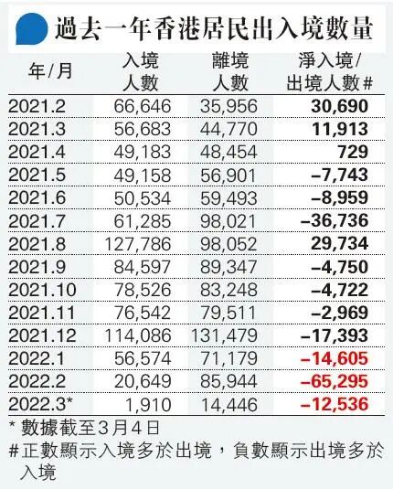去年1-3月,入境人数远远超过出境人数。但是,从今年1月1日起截止到3月4日,香港净出境人数超过了9.2万人!