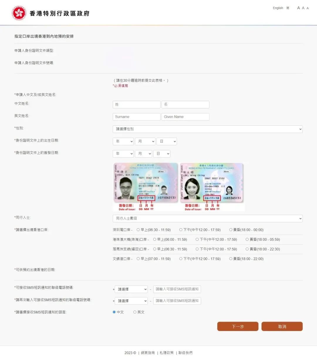 每个口岸提供早午晚三个时段选择,还要填写可在香港接收短讯的电话号码