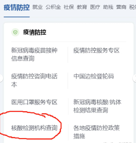 在国务院小程序中点击“更多”,然后选择”核酸检测机构查询“,就可以看到自己附近可以用于出境的核酸机构了。
