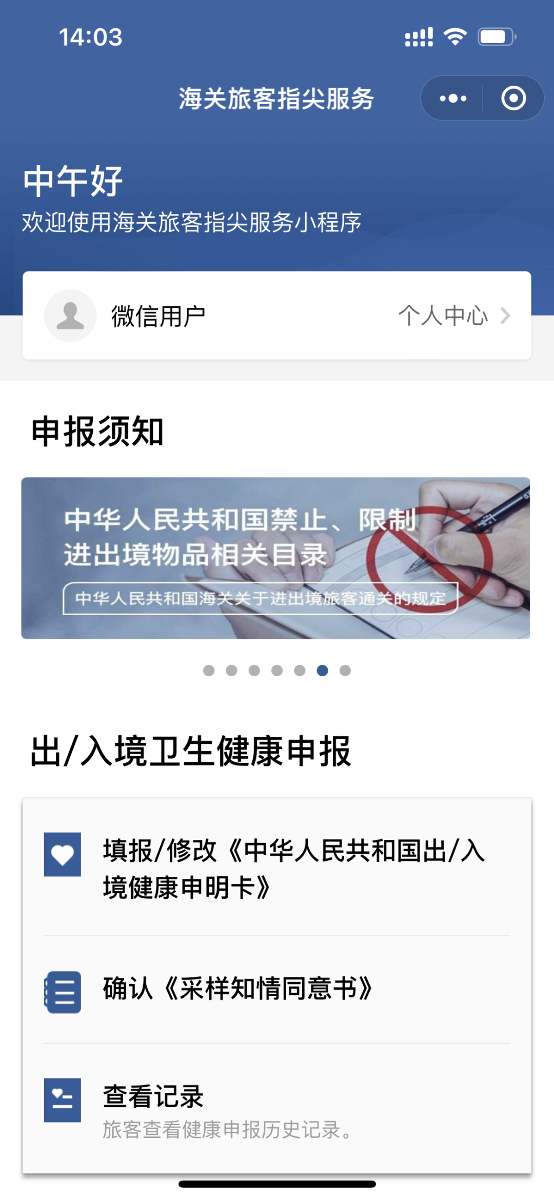 通过微信小程序“海关旅客指尖服务”进行健康申报,将核酸检测结果填入海关的出/入境健康申明卡。