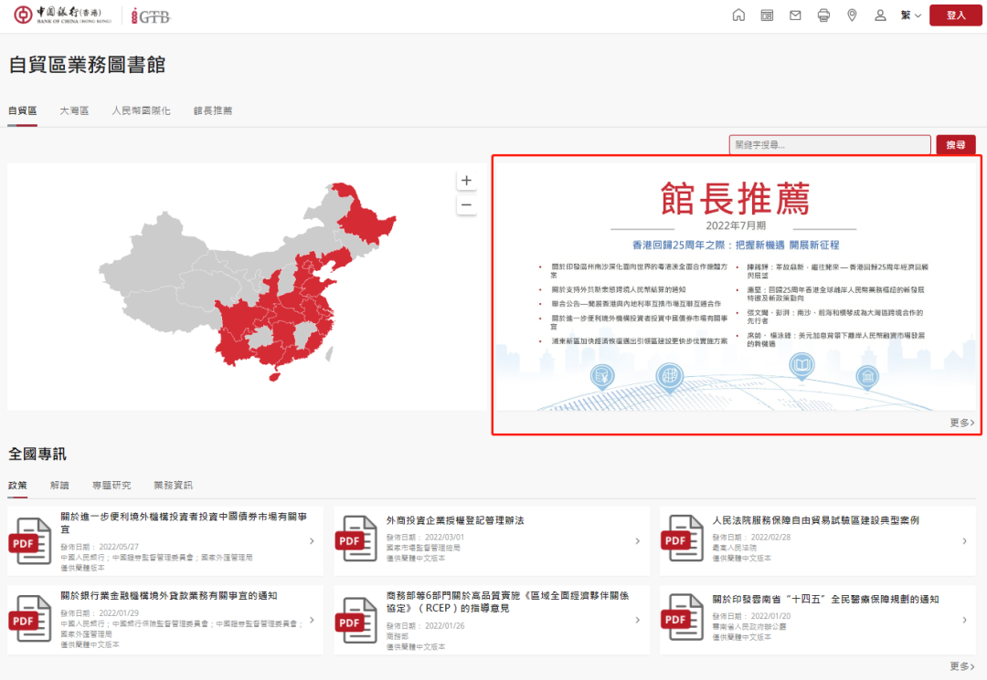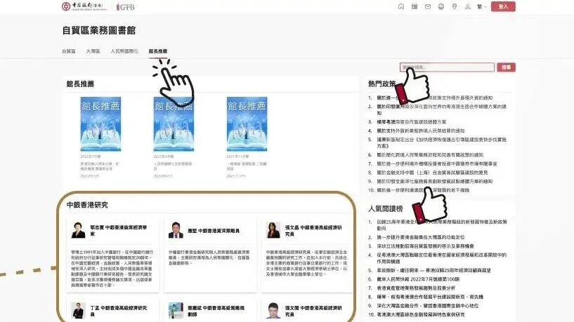 ✔ 您可透过"中银香港研究"、"热门政策"、"人气阅读榜",了解中银专家的专业分析、研究成果,以及馆内点击率最高的热门政策及人气话题。