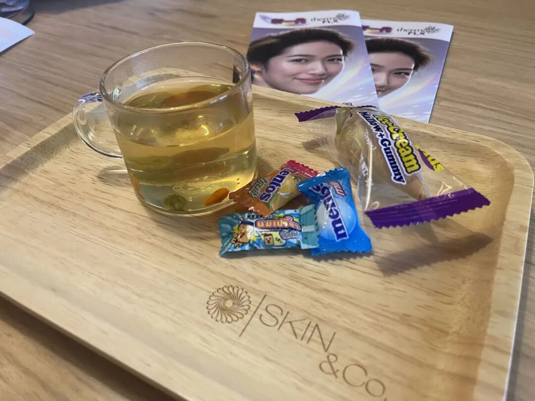 疗程结束后,服务也没有到此结束。在SKIN&CO.的休息室坐着补个妆,马上就有店员过来送上一杯花茶。