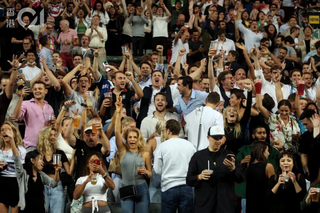 在一些市民享受户外烧烤聚餐的同时,另一些市民也摘下口罩,在七人榄球赛的赛场上举杯狂欢。