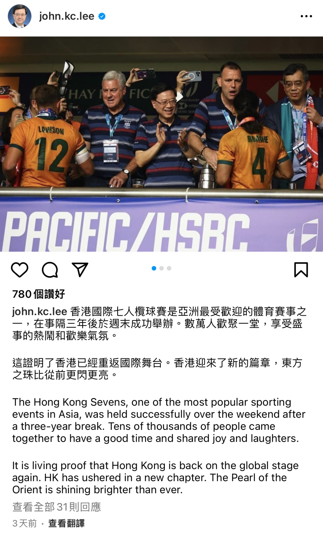 特首李家超先生也在自己的社交平台分享了去看比赛的喜悦,并向全世界宣布:香港已经重返国际舞台。
