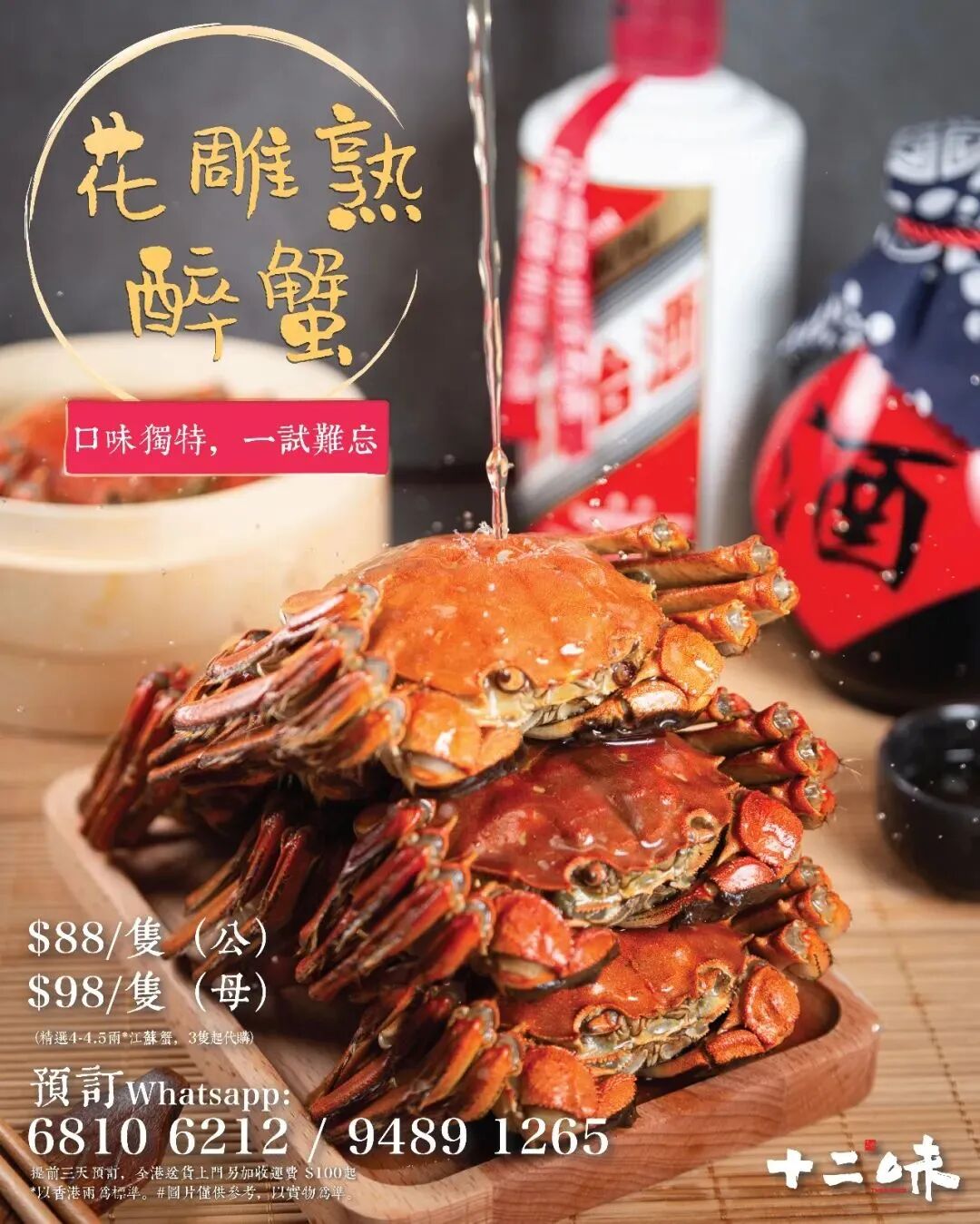 "花雕熟醉公蟹"优惠价$88/只