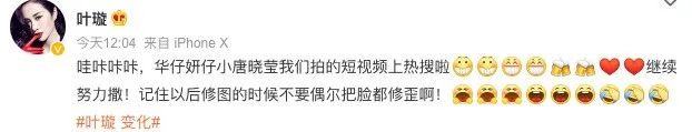 #叶璇变化#登上热搜后,本尊也迅速po自拍回应了,表示是p图p歪了。