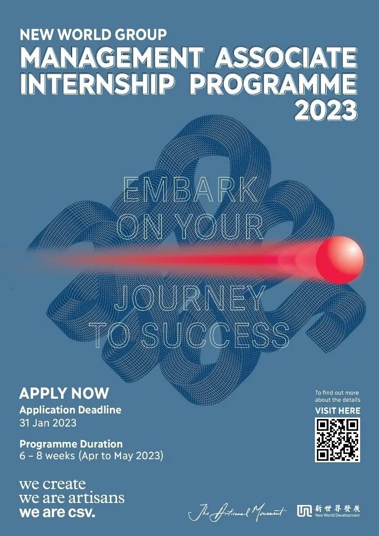 2023 年 1 月31日之前接受申请,合适的申请者将在2-3月被邀请参与新世界产业生态圈的实地考察及专项活动(话题涉及零售、医疗、可持续发展、地产、艺术、保险等等) ,并于最终评估日分享你的观点!
