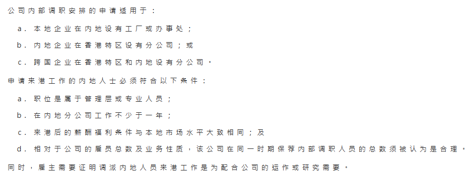 简单来说,如果你在内地或者其他国家/地区的公司工作,且香港有分公司/总部,就可以通过内部调职来公司工作。