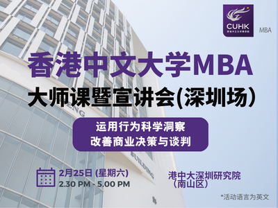 我们将于2月25日在深圳举办MBA大师课堂暨宣讲会。在此次活动,港中大商学院戴先炽教授将带领大家深入了解商业决策与谈判的相关知识,并学会运用行为科学洞察结论来指导企业管理,从而更高效地进行决策与谈判。