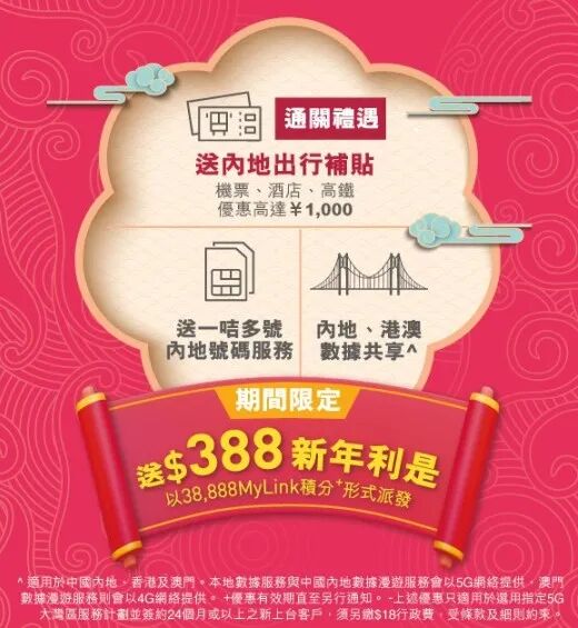^适用于中国内地、香港及澳门,本地流量服务与中国内地流量漫游服务会以5G网络提供,澳门地区流量漫游服务则会以4G网络提供。