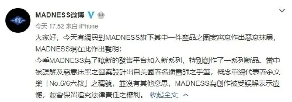 余文乐的潮牌火速下架了这件衣服,并且解释这个“5+1”的手势,代表的是余文乐本人“NO.6/6六叔”的称呼,没有其他含义: