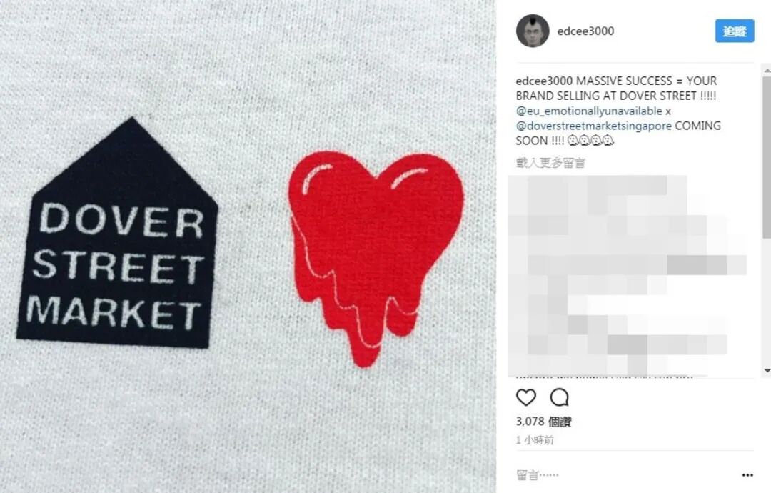 陈冠希这边也不甘示弱,直接PO出一张自家潮牌在“DOVER STREET MARKET”(设计师川久保玲创办,高档时尚零售店)售卖的照片。