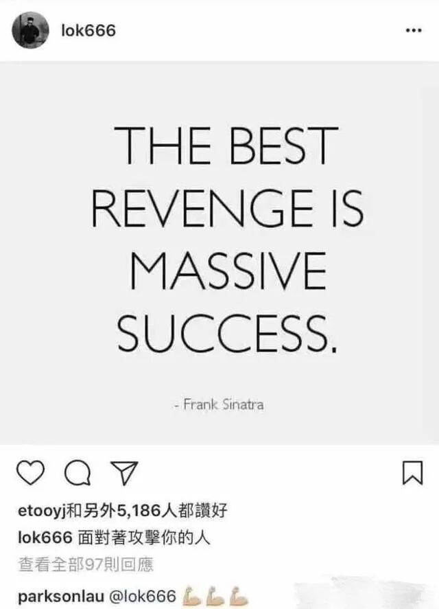 紧接着他在自己的ins上发了一句话:“最大的成功就是最好的报复”,文案写的是“面对着攻击你的人”,疑似回应陈冠希。