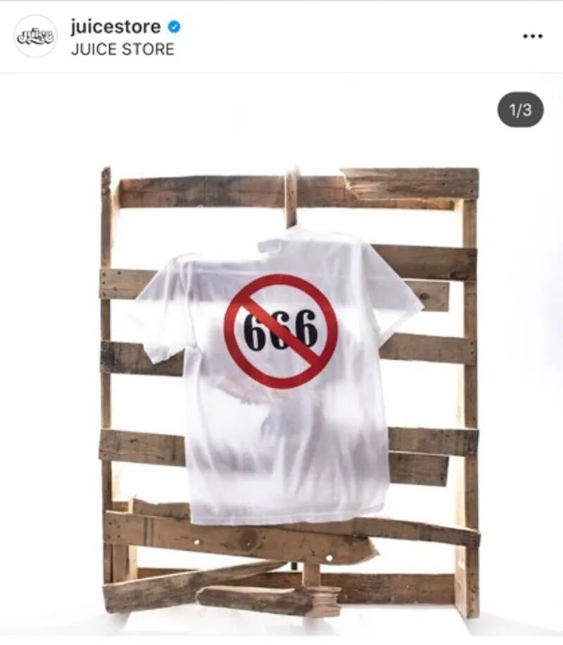陈冠希旗下的时装店juice,po了一张T恤,上面印的图案是“禁止666”: