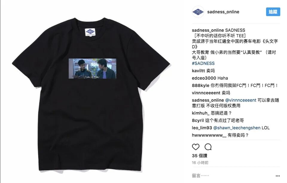 除夕之外,SADNESS还推出一款T恤,上面印着当年陈冠希和余文乐合作的《头文字D》,台词就是“不中听的话你想不想听”: