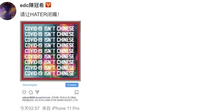 但是没过多久,陈冠希发了个帖子!说:新冠是全球的问题,不是中国的问题,请让HATER(仇视的人)闭嘴!