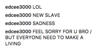 结果陈冠希在底下连怼4条,留言说“SADNESS”(悲哀),还说“对你表示遗憾,但毕竟每个人都要生存”,甚至说对方是“NEW SLAVE”(新奴隶),