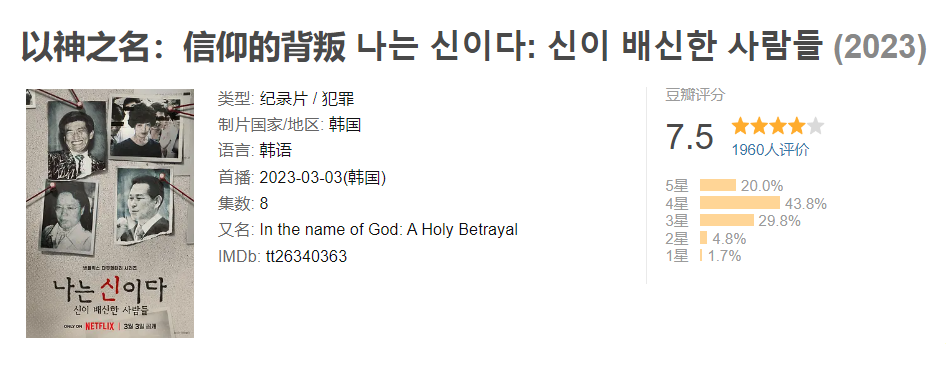 这部纪录片名叫《以神之名:信仰的背叛》,由Netflix出品,介绍了一个韩国的教会,名叫“摄理教”!