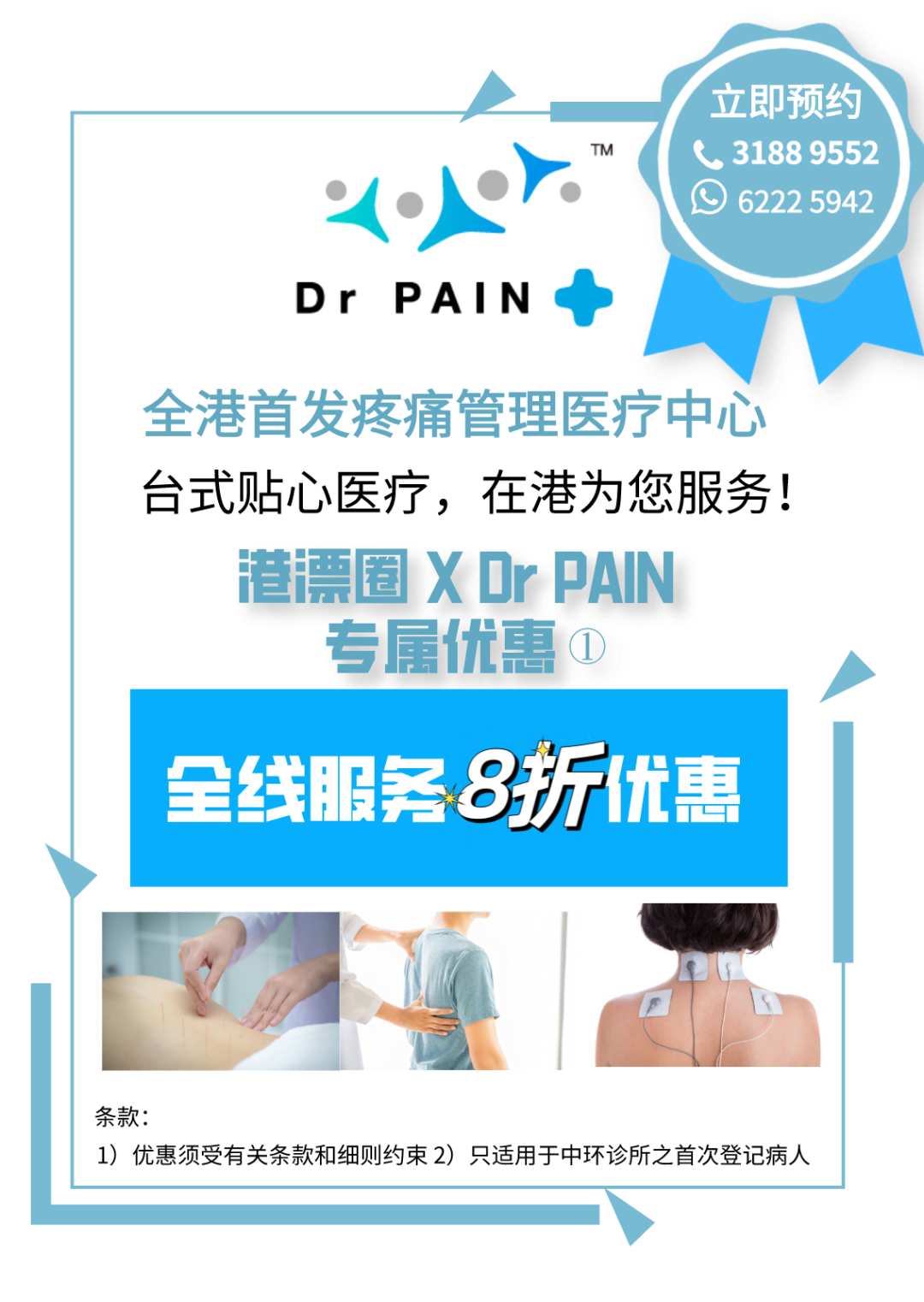对你没看错,不需要减肥的港漂圈读者也有福利,颈椎、腰椎、脊椎、关节等各种痛症疗程,物理治疗、脊医治疗、中医治疗等Dr PAIN的王牌治疗项目限时八折!