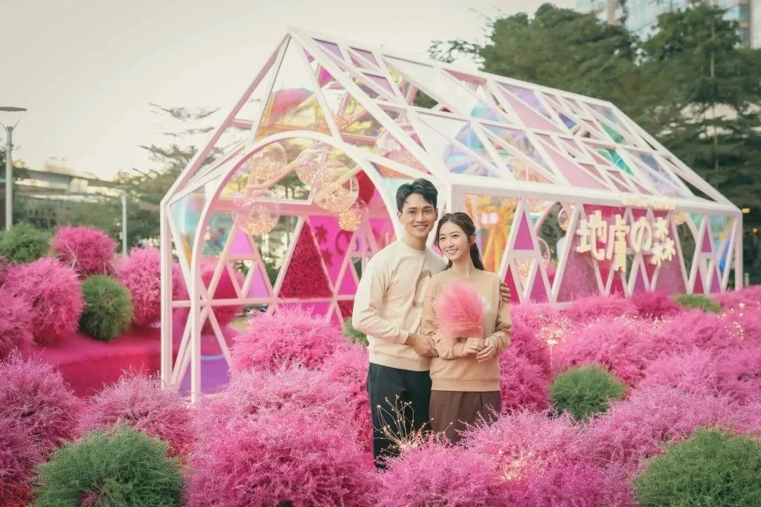 地肤,也称为「波波草」,圆润可爱,花语为「夫妻圆满」。在港版草园中,更参照旅客必访的日式小教堂,于漫天波波草海之间筑起唯美光影教堂,配合闪烁的水晶球隧道,合力打造2023最动人的爱情圣地,祝福天下情侣的五大心动瞬间——由祈求爱情、初见、告白、拍拖以至求婚一刻,都以红当当的「地肤之森」成为彼此信物。
