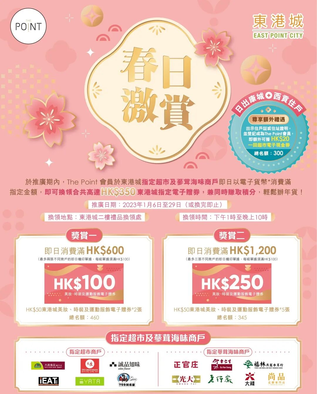 ①消费满HK$600➡️送HK$100东港城美妆、时装及运动服饰电子赠券