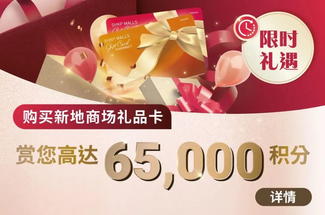 另外,新地商场现正推出新地礼品卡限时积分奖赏礼遇,即日起2023年1月31日,The Point会员于8家指定新地商场以AlipayHK、银联二维码或WeChat Pay HK购买指定面值礼品卡可享高达65,000积分奖赏????