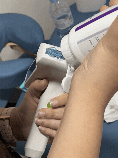 之后漫不经心地戴上了一副墨镜,把灯关上,正当我开始心跳加速,紧张又带点期待时,蔡医师拿出了他新购入的宝贝——全港唯一的LIGHTFORCE®治疗镭射器。