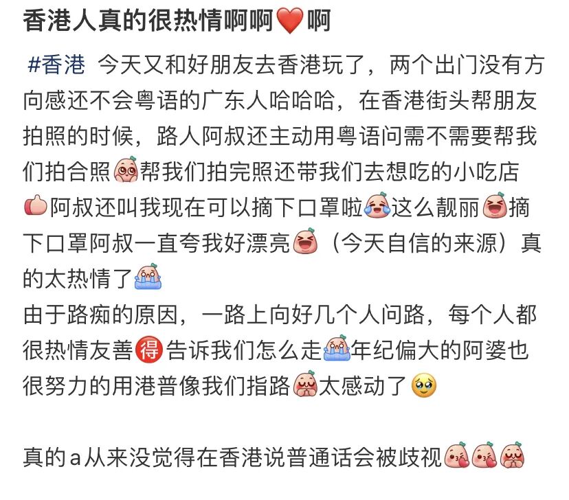 其实网络上也有很多人分享认为香港人很热情,餐厅店员会用不熟练的普通话交流,的士师傅会主动聊天,奢侈品专柜店员会热情推荐......